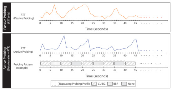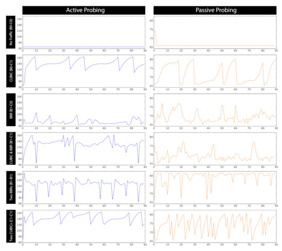 We introduce two probing techniques, passive and active, trying to generate representative end-to-end signals for the network workload. We later use those signals in a machine-learning task to build and train classification models for recognizing the background workload. Samples of generated RTT time-series using both techniques are presented in Figure 8 (traffic mixtures are further discussed in Section 5.1).