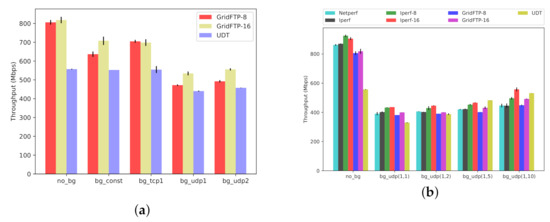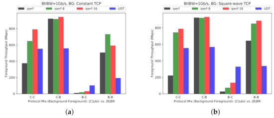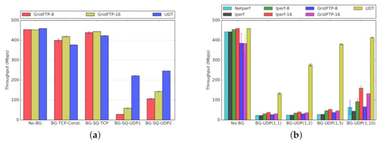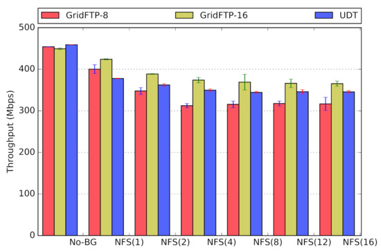 We consider both synthetic and application-based data-transfer workloads. A synthetic workload can be easier to describe, automate and reproduce than some other workloads. Using a variety of synthetic background network traffic (e.g., uniform, TCP, User Datagram Protocol (UDP), square waveform, bursty), we compare the performance of well-known tools and protocols (e.g., GridFTP, UDT [7], CUBIC [8], BBR [9]) on an emulated WAN network (Section 3.1). A noteworthy result of the synthetic workload experiments is the ability to quantify how poorly GridFTP performs when competing with UDP-based traffic. In particular, GridFTP’s throughput drops to less than 10% of the theoretical maximum when competing with bursty UDP traffic.