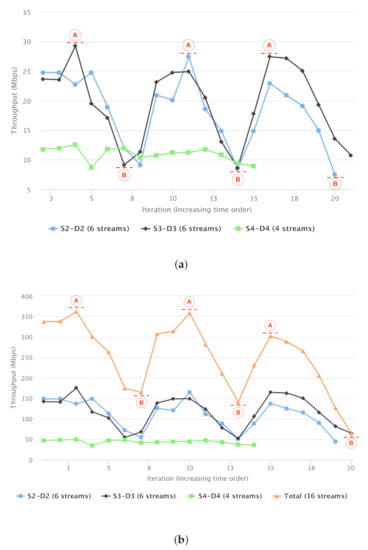 The key patterns of the background traffic, summarized in Figure 7a,b are: