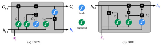 Illustration the difference between of (a) Long Short-Term Memory (LSTM) and (b) Gated Recurrent Unit (GRU).