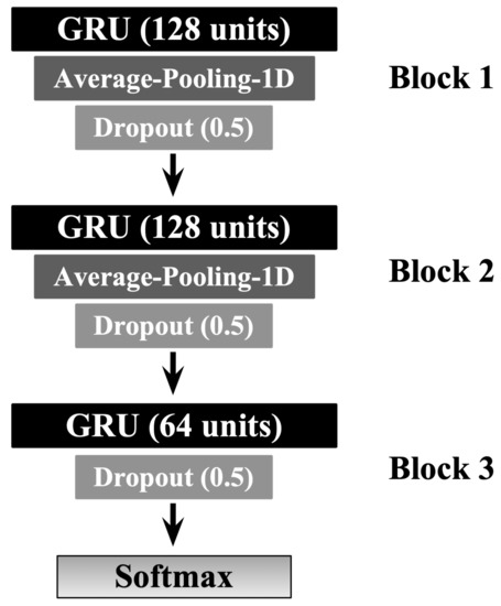 In this work, we applied the Gated Recurrent Neural Networks (or Gated Recurrent Units (GRU) for short) method to be used for the classification task. We spent quite an amount of time experimenting with varying GRU-based architectures and hyperparameters tuning choices to achieve the best possible results, including Figure 5 which demonstrates the best model design and configuration. The final GRU architecture consists of three GRU-based blocks, each of which is followed by a one-dimensional average pooling and a dropout layer. The pooling is to downsample the input representation by taking the average value over a defined-sized window called pool size and shifted forward by a particular value. In the dropout layer, individual nodes from the GRU netwrok are either dropped out with probability or kept with probability p. The experimental environment was implemented using TensorFlow v2.4.1 via the application programming interface Keras v2.4.1 [42,43]. The model training and prediction were performed on a workstation with an Intel Core i7-10700KF (3.8 GHz) CPU, Nvidia Geforce RTX 3060 Ti (8 GB) GPU, and 64 GB of RAM.