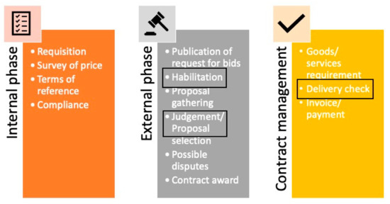 The external phase implies the publication of the records in order to promote fair competition. Usually, a request for bids is published containing the terms of reference and a draft of the contract for participants to check their admissibility in the process and the terms of the agreement they might become involved with. During the external phase, there is also the judging process to select the bidder presenting the most advantageous proposal. After those two phases, the third stage occurs in which the contract is awarded and managed until its conclusion.