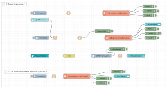 To verify the concept and to receive feedback from possible users of a smart contract-based procurement process, we implemented a prototype using the Node-RED framework and the Ethereum blockchain. Node-RED (https://nodered.org/, accessed on 29 June 2021) is an Open-Source flow-based graphical development system that is ideal for prototyping processes. It is commonly used for Internet of Things (IoT) applications since it offers a huge variety of implemented nodes for transaction protocols. In addition, there exists a dashboard node-set that makes it possible to easily build a simple user interface (https://flows.nodered.org/node/node-red-dashboard, accessed on 29 June 2021). Figure 3 shows a section of the Node-RED flows and Figure 4 shows the user interface to give a visual impression of how the prototype is displayed to the user. Detailed information and the source code of the prototype can be found on Github (Code of Prototpye is available under https://gitlab.enterpriselab.ch/gvoutat/procurement but will be moved to https://github.com/timweing after students leave university, accessed on 29 June 2021.