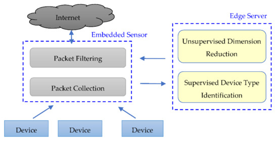In this paper, we propose a two-stage machine learning approach to anomaly detection through network traffic analysis in IoT. To capture all network packets generated from various devices, we design a system architecture consisting of an embedded sensor and an edge server on the LAN of IoT devices, with four modules: packet collection, supervised device type identification, unsupervised dimension reduction, and packet filtering, as shown in Figure 1.