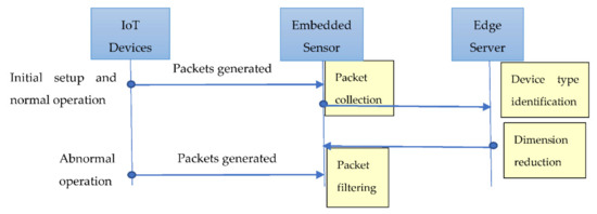 As shown in Figure 2, when deploying new devices, they will first be configured to communicate with the embedded sensor. This involves a few packet exchanges during the device setup process, during which we collect the network packets for device type identification. After the setup process is complete, the corresponding model can be automatically learned from the extracted features in normal packets and deployed to the packet filtering module that configures the corresponding filtering rules for examining incoming packets and discovering potential outliers. In the following subsections, we will describe each module in more detail.
