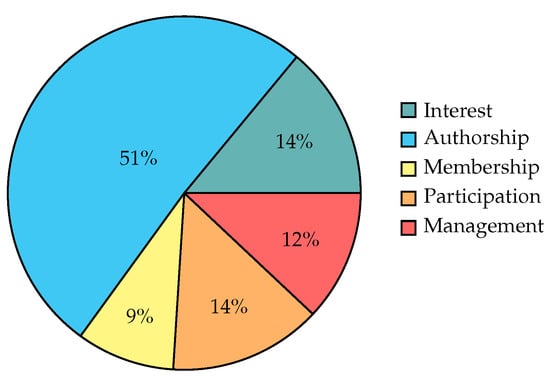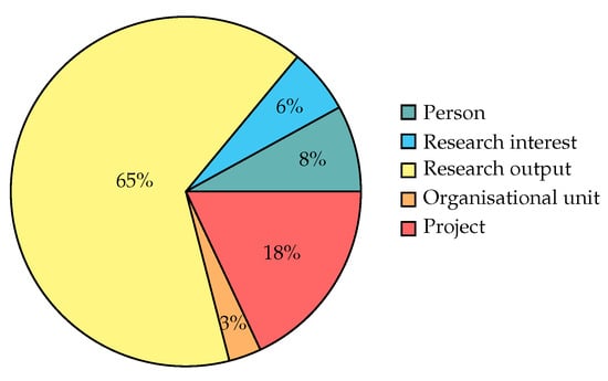 After getting the entire set of data described, the resulting knowledge graph comprises 364 nodes (i.e., entities), of which 30 are persons, 9 organisational units, 236 research outputs, 22 research interests and 67 projects. Regarding relations, the knowledge graph is constituted by 556 edges, of which 281 are labeled as “authorship”, 79 as “interest”, 49 as “membership”, 80 as “participation” and 67 as “management”. Figure 1 and Figure 2 show, respectively, the distribution of entity and relation types within the GEI knowledge graph.