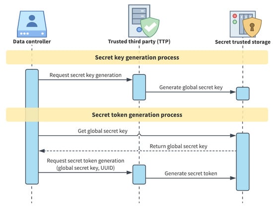 To increase robustness and security of our de-identification approach, a symmetric-key encryption based on the standard AES algorithm is used to generate a different secret token for every entity subject of pseudonymisation, taking in as input both the global secret key and each specific entity’s UUID. Symmetric-key encryption (or simply symmetric encryption) is a type of encryption where only one key, namely a secret key, is used to both encrypt and decrypt information. This process, like all those presented later in the paper, is consistent, meaning that different executions produce the same result in order to meet the requirement of reproducibility for data controllers. The secret tokens are saved, as the global secret key, in the secret trusted storage mentioned and will be utilised to transform sensitive attributes in unique pseudonyms for each entity in an oblivious manner. No information about the original identifiers will be learned or stored but only replaced as new attribute values. Figure 3 shows the secret key and secret tokens generation process diagram.