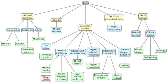 About research interests, the pseudonymisation process concerns the modification and the generalisation of the “interest” relation with persons. The objective is to remove or adapt any potential re-identifying links, such as an interest with a unique outbound edge towards a pseudonymised user. The approach proposed in the continuation of this section is crucial in our paper, and it is worth noticing that it applies to any knowledge graph where a hierarchical attribute, such as field of study or paper keywords, needs to be de-identified. De-identifying research interests involve the utilisation of a generalisation hierarchy. We built a custom hierarchical tree structure for research areas of interest in our application domain derived from the International Standard Classification of Education (ISCED-F 2013 – https://tinyurl.com/unesco-org-isced-f-2013-pdf; last seen on 18 August 2021) and the ACM Computing Classification System (CCS – https://dl.acm.org/ccs; last seen on 18 August 2021). The hierarchical tree structure is shown after the description of the pseudonymisation process in Figure 5.