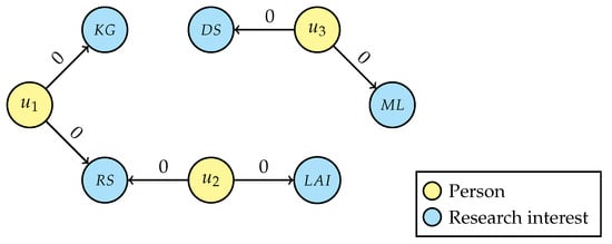 To describe the pseudonymisation process, let us start from the simplified and illustrative situation displayed in Figure 6, in which we find three “Person” nodes, two of whom share a common interest, and five “Research interest” nodes, being “Knowledge graphs” (KG), “Recommender systems” (RS), “Legal artificial intelligence” (LAI), “Machine learning” (ML) and “Data science” (DS). The attribute value “0” on the “interest” relations indicates that they are the genuine research interests revealed by the users within the user study, as opposed to value “1” representing a pseudo-relation needed for de-identification, as described in a later stage of the procedure.