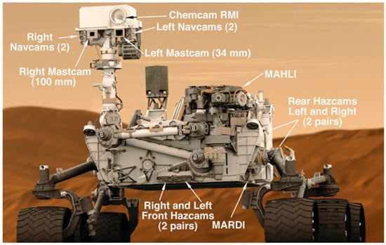 This paper will focus on the Curiosity rover. Onboard the Curiosity rover, there are a few important instruments. The laser induced breakdown spectroscopy (LIBS) instrument, ChemCam, performs rock composition analysis from distances as far as seven meters []. Another type of instrument is the mast cameras (Mastcams). There are two Mastcams []. The cameras have nine bands in each with six of them overlapped. The range of wavelengths covers the blue (445 nanometers) to the short-wave near-infrared (1012 nanometers).