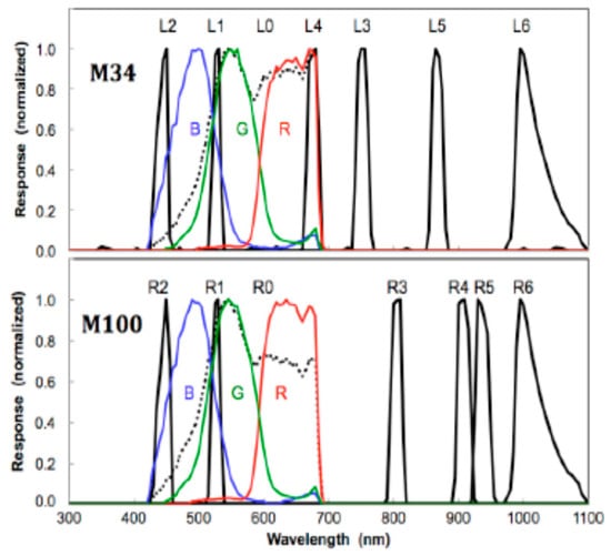 Spectral response curves for the left eye (top panel) and the right eye (bottom panel) [].
