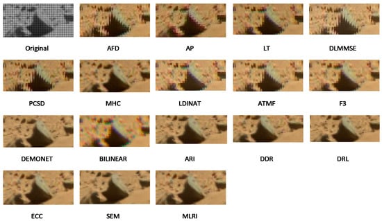 We compared the following algorithms: linear directional interpolation and nonlocal adaptive thresholding (LDI-NAT) [], MHC [], DLMMSE [], Lu and Tan interpolation (LT) [], adaptive frequency domain (AFD) [], alternate projection (AP) [], primary-consistent soft-decision PCSD [], ATMF [], DEMONET [], fusion using three best (F3) [], bilinear, sequential energy minimization (SEM) [], deep residual network (DRL) [], ECC [], minimized-Laplacian residual interpolation (MLRI) [], adaptive residual interpolation (ARI) [], directional difference regression (DDR) [].