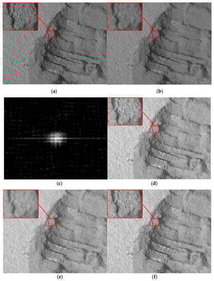 Image enhancement performance of an LR-pair on sol 0100 taken on 16 November 2012 for L0R filter band aligned image using PSF estimated from 0G filter bands. (a) Original R0G band; (b) L0G band; (c) estimated PSF using L0G image in (b) and R0G image in (a); (d) R0R band; (e) L0R band-PSNR = 24.78 dB; (f) enhanced image of (e) using PSF estimated in (c) PSNR = 30.08 dB.