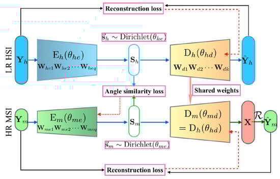 Over the past two decades, a large number of papers was published on the subject of pansharpening, which is the fusion of a high resolution (HR) panchromatic (pan) image with a low resolution (LR) multispectral image (MSI) [,,,,]. Recently, we proposed an unsupervised network for image super-resolution (SR) of hyperspectral image (HSI) [,]. Similar to MSI, HSI has found many applications. The key features of our work in HSI include the following. First, our proposed algorithm extracts both the spectral and spatial information from LR HSI and HR MSI with two deep learning networks, which share the same decoder weights, as shown in Figure 6. Second, sum-to-one and sparsity are two physical constraints of HSI and MSI data representation. Third, our proposed algorithm directly addresses the challenge of spectral distortion by minimizing the angular difference of these representations. The proposed method is coined as unsupervised sparse Dirichlet network (uSDN). Details of uDSN can be found in our recent work [].