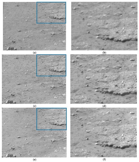 Results of pansharpening for Mars images. Left column (a,c,e) shows the original images; right column (b,d,f) is the zoomed in view of the blue rectangle areas of the left images. The first row (a,b) shows third band from the left camera. The second row (c,d) shows the corresponding reconstructed results. The third row (e,f) shows the third band from the right camera.