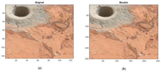 Three algorithms were used to improve left camera images. The bicubic interpolation [] was used as the baseline technique. Another method [] is an adaptation of the technique in [] with pansharpening [,,,,]. Recently, deep learning-based SR techniques [,,] have been developed. We used the enhanced deep super resolution (EDSR) [] as one representative deep learning-based algorithm in our experiments. It should be emphasized that no one, including NASA, has carried out any work related to this stereo generation effort. As a result, we do not have a baseline algorithm from NASA to compare with.