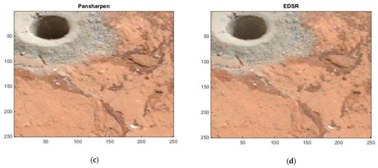 Image enhancements on 0183ML0009930000105284E01_DRCX_0PCT.png. (a) Original left camera image; (b) bicubic-enhanced left camera image; (c) pansharpening-based method enhanced left camera image; (d) EDSR enhanced left camera image.