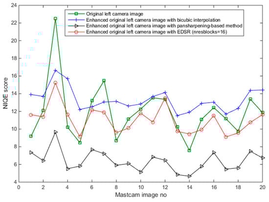 Natural image quality evaluator (NIQE) metric results for enhanced “original left Mastcam images” (scale: ×2) by the bicubic interpolation, pansharpening-based method, and EDSR.