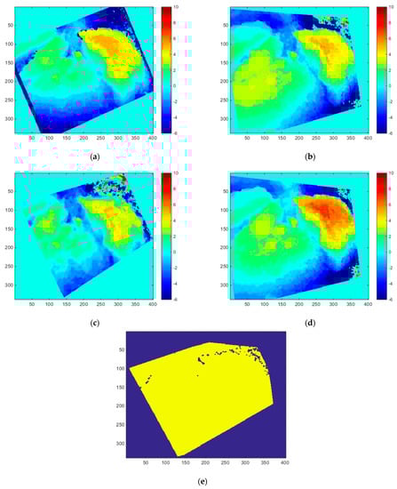 Figure 10 shows the estimated disparity maps with the three image enhancement methods for Image Pair 6 in []. Figure 10a shows the estimated disparity map using the original left camera image. Figure 10b–d show the resultant disparity maps with the three methods. Figure 10e shows to the mask used when computing the average absolute error values. According to our paper [], the disparity map shown in Figure 9d has the best performance. More details can be found in [].