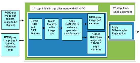 Figure 11 illustrates the proposed two-step approach. The first step uses RANSAC (random sample consensus) technique [] for an initial image alignment. SURF features [] and SIFT features [] are then matched within the image pair.