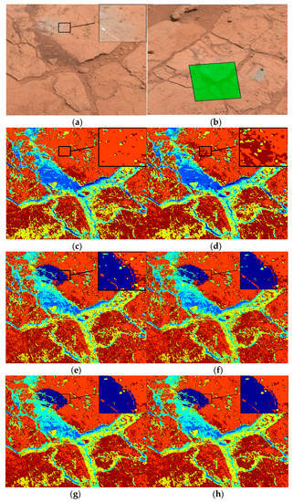 Clustering results with six classes of an LR-pair on sol 0812 taken on 18 November 2014. (a) Original RGB right image; (b) original RGB left image; (c) using nine-band right camera MS cube; (d) using twelve-band MS cube after first registration step with lower (M-34) resolution; (e) using twelve-band MS cube after the second registration step with lower resolution; (f) using twelve-band MS cube after the second registration step with higher (M-100) resolution; (g) using pan-sharpened images by band dependent spatial detail (BDSD) []; and (h) using pan-sharpened images by partial replacement adaptive CS (PRACS) [].