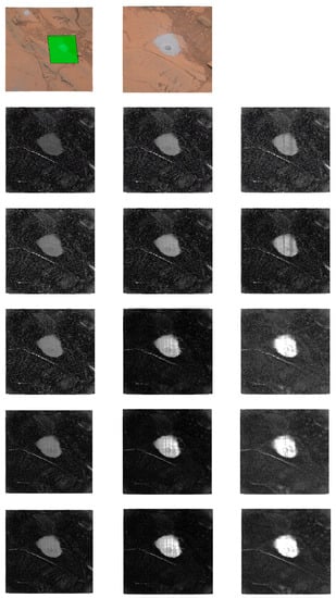 Figure 13 displays the anomaly detection results of two LR-pair cases for the three competing methods (global-RX, local-RX and NRS methods) applied to the original nine-band data captured only by the right Mastcam (second row) and the five twelve-band fused data counterparts (third to seventh rows). There is no ground-truth information about anomaly targets. Consequently, we relied on visual inspection. From Figure 13, we observe better detection results when both RANSAC and diffeomorphic registration steps are applied as compared with just RANSAC registration. Moreover, the results using BDSD and PRACS pan-sharpening produce less noise than the detection outputs of purely registration-based MS data.