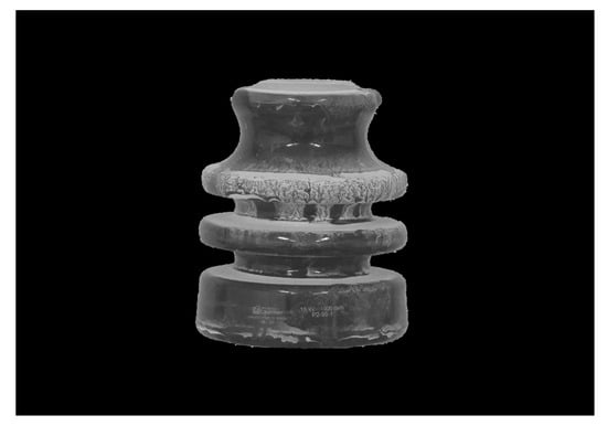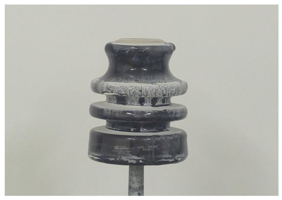 The photographic capture of the insulators under different levels of contamination was carried out with an LG H-818 sensor that has a focal aperture of 1.8. For standardization of photo registration, the exposure time was set at 3.33 ms, light sensitivity was set at ISO 150, and the focal length was set at 4 mm. A photograph of a contaminated insulator is presented in Figure 1.
