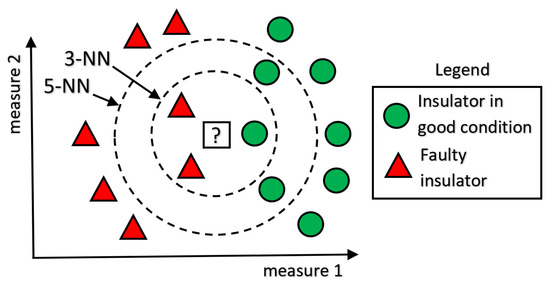 The method of the nearest neighbor has variations defined by the number of neighbors considered; for this reason, the number of neighbors is an evaluation parameter discussed in this paper. In the k-NN model, the k objects of the training set closest to are evaluated [57]. When k is greater than one, the neighboring k is obtained for each test point. Figure 3 shows the impact of using the value of k on the k-NN model. As can be seen, considering k , the test is classified with a failed (defective) insulator, while for k, the insulator would be classified as a component in good condition.