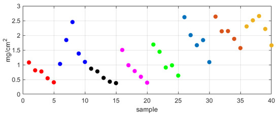 In addition to the six variations in the Kaolin concentration, two classes were analyzed with the inclusion of salt (to evaluate ESDD), resulting in six concentration variations and eight evaluated classes. In Figure 4, the NSDD results are presented in mg/cm for the 40 analyses performed, being divided into eight classes (presented in different colors) with five insulators in each class.