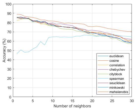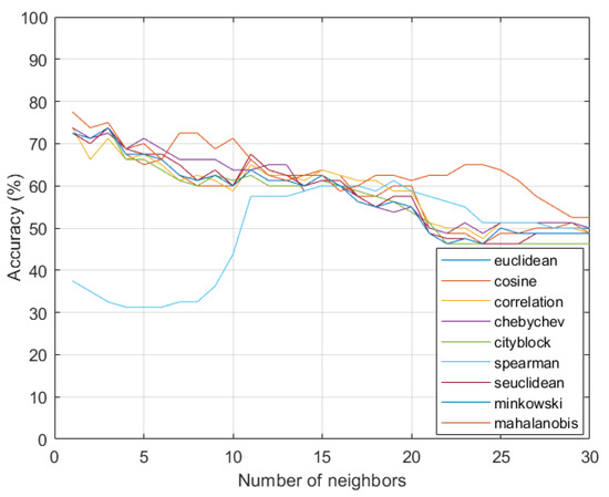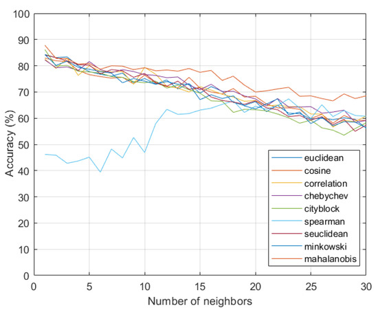 For a complete evaluation of the variation of the result in relation to the function for the calculation of neighbor distance, in this paper, several functions were used. From an -by-n data matrix Y, which is treated as my (1-by-n) row vectors , and an -by-n data matrix X, which is treated as (1-by-n) row vectors , the distances between the vector and could be defined according to the Euclidean distance (13), cosine distance (14), correlation distance (15a), chebychev distance (16), city block distance (17), spearman distance (18), standardized Euclidean distance (19), minkowski distance (20), and mahalanobis distance (21).