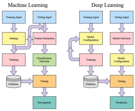 The similarities in the construction of our machine learning and deep learning algorithms, as shown in Figure 1, denotes the similarities between the two. Both algorithms follow a similar route for execution and use inputs to test for successful recognition. Both algorithms store the results of their training for future comparison and testing. Still, the most notable differences are the number of iterations or epochs that deep learning uses to learn and perform better. Machine learning algorithms take input and apply the settings and execute a mathematically complex algorithm once.