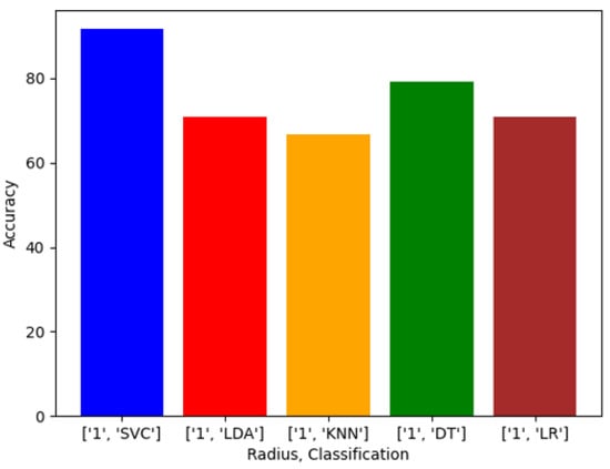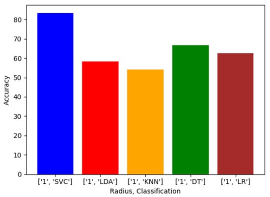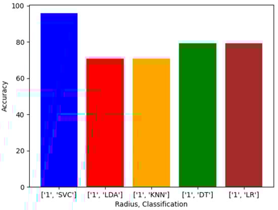 Using SVC, image classification for a multi-class approach is achieved by constructing linear decision surfaces using high-dimensional features mapped by non-linear input []. LDA is used as a classifying approach by using a normally distributed dataset and projecting the input to maximize the separation of the classes []. Classification utilizing KNN is achieved by assigning classes to the output. The designation is concluded by the overall counts of its nearest cohorts, and the class assignment goes to the class with the most common neighbors []. The DT approach yields its classifications as a structure and treats each child or leaf as a subset without statistical reasoning []. The LR approach reaches the classification by considering the probability that a class exists where the outcome is that a training image and a test image belong to the same class [].