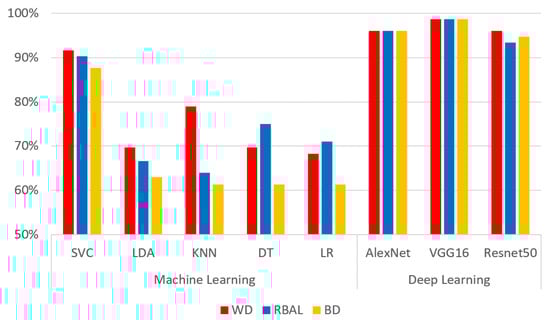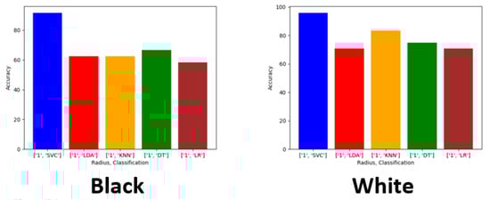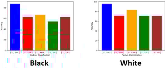 Machine learning algorithms make informed decisions by parsing data and learning from the collected data []. Typically, these techniques are used to examine large databases to extract new information as a form of data mining. Many large companies use machine learning to provide an improved user experience in human–computer interaction. These improvements may include a recommendation based upon preferences or suggestions based on previous selections []. Machine learning algorithms require outside exchange if corrections or adjustments are necessary. A general analogy to envision a machine learning algorithm can be demonstrated by using a flashlight. If we teach the flashlight with a machine learning model, it will understand light and dark. If provided with the word dark, the flashlight will come on. The opposite will occur if the word light is used. However, if presented with a word or phrase it has not learned, such as dim, it will not function and require additional adjustments to accommodate the new expression []. Gwyn et al. [] studied traditional machine learning techniques prompting further research in facial recognition, specifically regarding racial bias. We have chosen Support Vector Classifier (SVC), Linear Discriminant Analysis (LDA), K-Nearest Neighbor (KNN), Decision Trees (DT), and Logistic Regression (LR) algorithms from []. These algorithms are used for several applications and the approaches can vary such as regression, clustering, dimension reduction and image classification. For our study, we choose to apply these algorithms using classification methods and do not combine or use them in tandem to produce observable results for each algorithm.