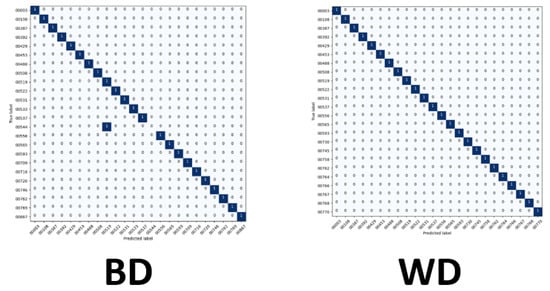 The other matrices indicate similar performance with ResNet50 missing one subject when using the Black dominant (BD) dataset, but missing none when using the White prevailing dataset, as shown in Figure 15.