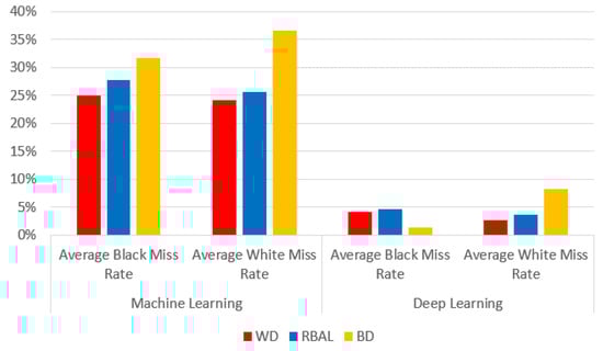 An additional consideration to verify the superiority of these deep learning algorithms can be seen by surveying the miss rates. The initial miss rates were significantly higher for the machine learning algorithms. The results were high in numbers, and the difference in the miss rates across racially weighted datasets was vast. The use of deep learning algorithms drastically reduced the miss rate, but it did so for both ethnicities, as shown in Figure 18.