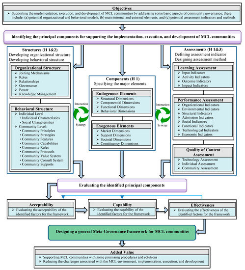 Given the above, it is necessary to raise the importance of a comprehensive governance structure for MCL that provides a clear understanding and oversight about how a learning community can be directed and managed as well as how its objectives could be set and achieved. Therefore, the main contribution of this article is proposing a meta-governance framework for an MCL community (MGF-MCL), aimed at driving and supporting its implementation, operation, and management. The MGF-MCL consolidates the integration of ideas from different governance styles (some organizational, behavioral, and governance structures, as well as a set of assessment methods) to achieve an effective outcome.