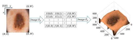 A digital image is a discrete two-dimensional function , where x and y are discrete spatial coordinates in the plane. The breadth of a coordinate pair is called the gray level intensity of the image at that point. An image is represented by a two-dimensional array , where and represent the size of the image (referencing and to height and width of the image, respectively), with (Figure 1) [].