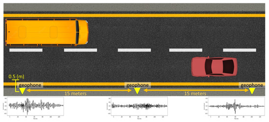 We used video records as a visual guide to preparing the events/vehicles catalog. The video camera and geophones were synchronized to a GPS clock to ensure accuracy in data preparation. However, the video/images were not used as data input for the algorithms. When an automobile was near the geophone, each event (i.e., the passage of a vehicle) lasted 2–3 s.