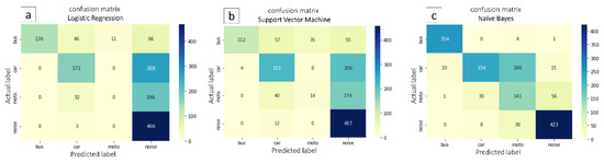 The confusion matrix of LR detection is presented in Figure 6a. Table 1 shows the precision, recall, and f1-score for each class of LR calculated based on the result of Figure 6a. Based on Figure 6a, LR has failed to detect any motorcycle signals, while it has overpredicted the noise, especially for car and motorcycle classes.