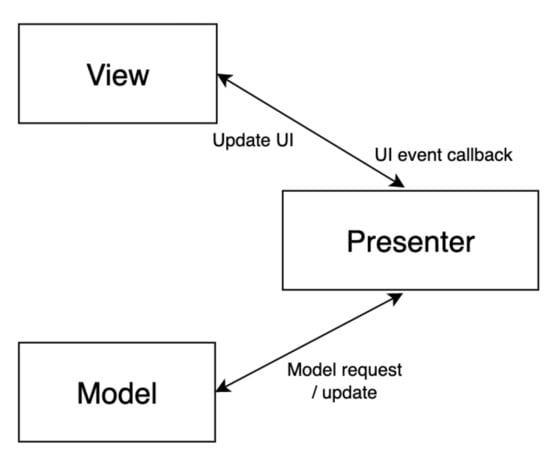 The Model–View–Presenter (MVP) architecture is derived from the Model–View–Controller (MVC) pattern and mostly followed by projects that have a user interface []. It facilitates the separation of concerns (i.e., user interface and data processing are developed separately) and simplifies overall development including testing. Figure 1 presents the design of MVP architecture. The three main components/layers that make up MVP architecture are as follows []: