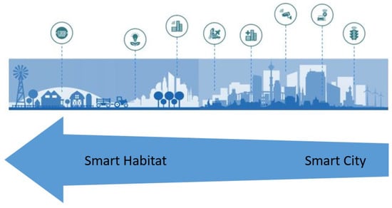 In these settlements (habitat fragments), there is also a need to automate life processes and ensure the personal and technical safety of residents. This raises the question of smart habitats (SHs) as a more universal and scalable application of an interconnected system of information and communication technologies with IoT [2], which simplifies the management of internal processes of the environment and makes the life of residents more comfortable and safe [3]. When considering the issue of constructing a SH, it is necessary to note two variants of approaches—the creation of a SH and the smart transformation of the habitat in the SH.