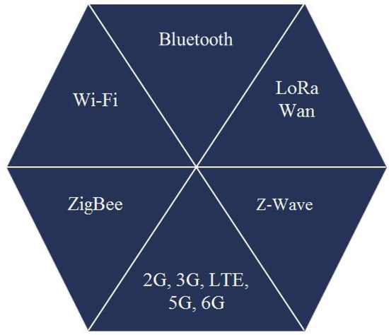 Along with wired DTS, a wireless method of building networks has become widespread, a feature of which is the possibility of organizing communication in a variant inaccessible to wired DTS. In various IoT projects, IoT connections can be based on technologies, such as Bluetooth, Wi-Fi, Lora WAN, ZigBee, Z-wave, 3G, LTE, 5G, 6G and others (Figure 4) [20].