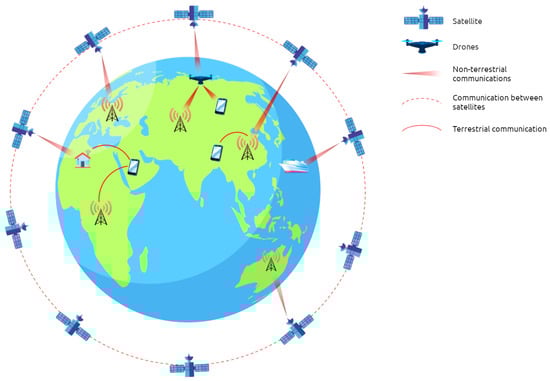 Thus, when transforming during the creation of NTI, an integrated approach to the issue of choosing a DTS is expedient. In this situation, an important role is given to 5G/6G cellular networks, which are expected to provide global coverage of the entire Earth’s surface so that users and connected IoT can access the Internet anywhere and anytime [24]. Wireless terrestrial networks need to be combined with air and water off-Earth access nodes. Such communication nodes will include satellites, drones, high-altitude platforms (HAP), surface signal broadcast stations, etc. The seamless 3-D (land, sea and sky) coverage built in this way will form a global integrated communication network, where all terrestrial and non-terrestrial networks will be comprehensively integrated at the system level, thereby, providing the convergence of services, wireless interfaces, various types of networks and connected user devices (Figure 5).