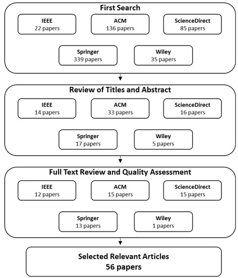 Figure 1 shows the article selection process. We conducted the first search process using the search string and databases defined in Section 3.2. We found 617 articles in this first search; then, we selected 165 papers in the title review; as a result of the abstract review, we selected 85 papers; and finally, we accepted 56 papers when we reviewed the full-text of the papers, which includes the quality assessment process. For example, we discarded some papers because they did not present enough data to replicate their work and did not present their results. Other papers were discarded because they did not present any performance measurement, and the information presented was confusing or did not correspond with their results. We applied the inclusion and exclusion criteria among all the studies’ selection processes.