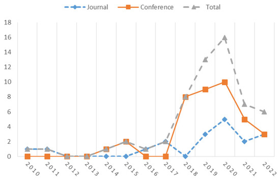 Figure 2 shows the distribution of the relevant articles from 2010 to 2022. It can be noted that the years with the most relevant articles are 2020 and 2019. In addition, a clear upward trend can be observed until 2020, before falling abruptly in 2021. However, this behavior could change in 2022, when almost the same papers are published. There is also a more significant number of articles published in conferences compared to those published in journals.