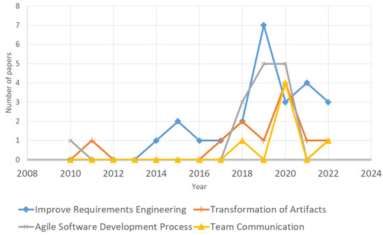 During the analysis of complete texts, we found that a few works (three papers) focused on working on a specific agile methodology: two focused on Scrum and one on Extreme Programming. On the contrary, it is preferred to focus on common problems without distinguishing which method is performed when presented. The use of user stories as a fundamental artifact was found in 27 papers; other artifacts used in the selected papers are use case diagrams, use case scenarios, goal models, and class diagrams. Additionally, the findings suggest that it is preferred to focus on documentation artifacts used in various methodologies.