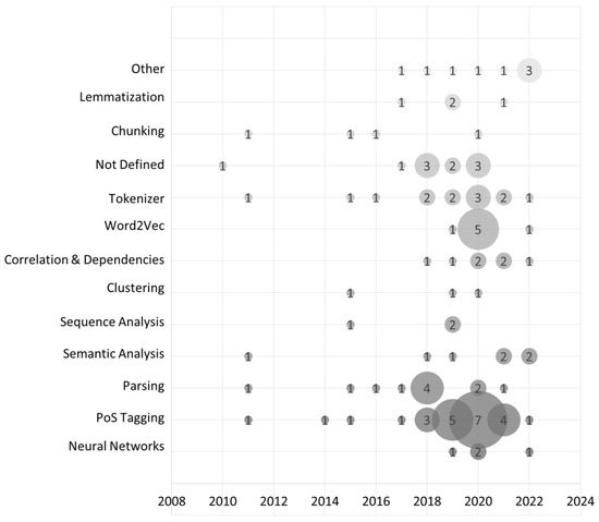 - Processing Techniques: This category encompasses those techniques that process the information of the text to find and extract specific data to be analyzed.