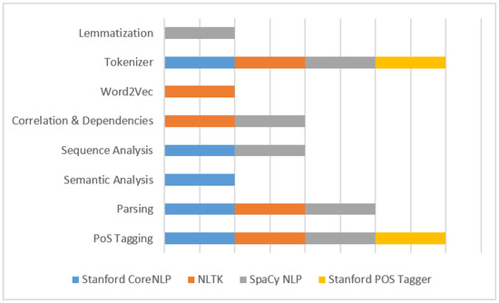 - Parsing. It consists of identifying the syntactic structure of a text by analyzing its words based on the language’s grammar of the given text. One important element of this technique is the parsing tree, which represents the structure of the text and can be represented visually [36,37].