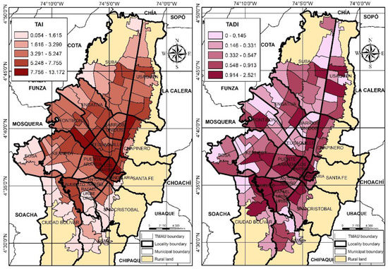 Spatial distribution of TAI (on the left) and TADI (on the right) in the study area. Authors’ map.