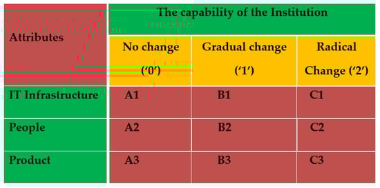 Each of the framework’s attributes—IT infrastructure, products, and people—are assessed concerning three different capability measures: radical change, no change, and gradual change. The institution will receive a score of “0” if it is unable to make any modifications or improvements for the attribute “IT infrastructure,” a score of “1” if it can make some minor adjustments, and a score of “2” if it can afford to make large modifications or remarkable progress within a short amount of time. In this way, the capacity is measured for the other attribute “people.” An OEMT (“Online education management tool”) is given a score of “1” if it can help people accept and cope with minor changes, a score of “2” if it can help people accept adjustments made by an OEMT at any time, and a score of “0” if the individuals in question cannot adapt to any changes.